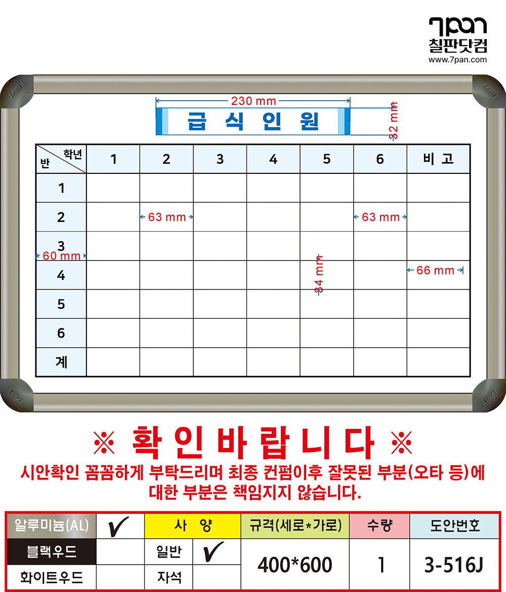 (도안) 초등학교 급식실 급식 인원 현황판 칠판 화이트보드판 인원현황 (제품번호 2024년 3-516)